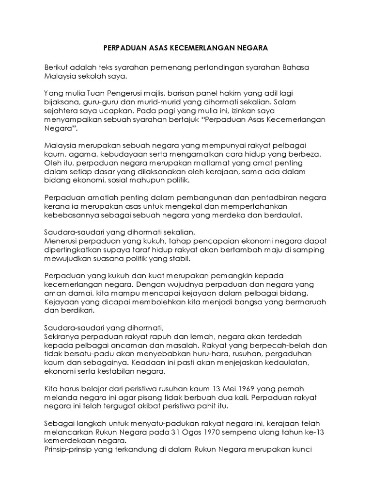 Perpaduan asas kecemerlangan negara berikut adalah teks syarahan pemenang pertandingan syarahan bahasa malaysia sekolah. Sidang hadirin sekalian indahnya bahasa melayu begitu halus sehingga menusuk kalbu. Pucuk manis permatang budi pucuk purut di getus rusa yang manis bernama budi yang indah bernama bahasa.